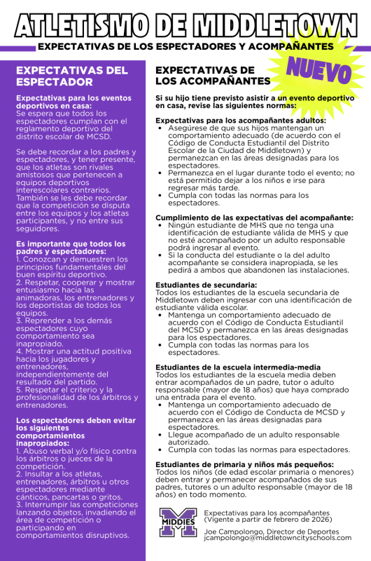 - Ensure their children maintain appropriate behavior (according to the Middletown City School District Student Code of Conduct) and remain in designated spectator areas.