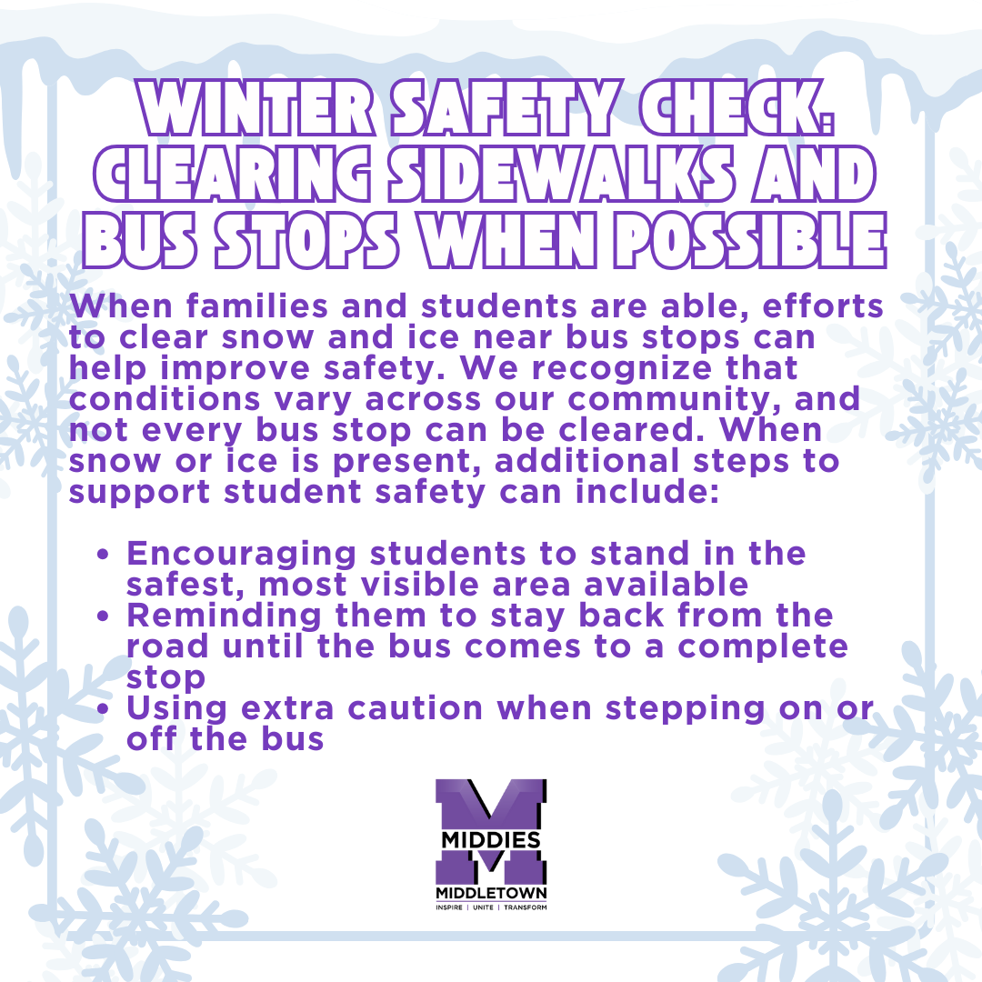As winter temperatures drop to very cold levels this week, Middletown City Schools remains focused on keeping students and families safe and supported. We continue to monitor conditions across school campuses and roadways in coordination with our transportation department and will communicate when delays or closures become necessary.